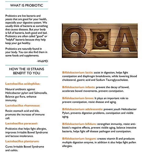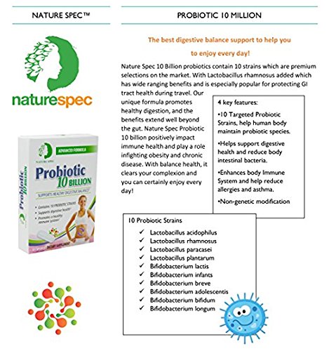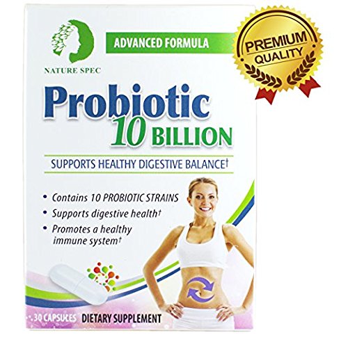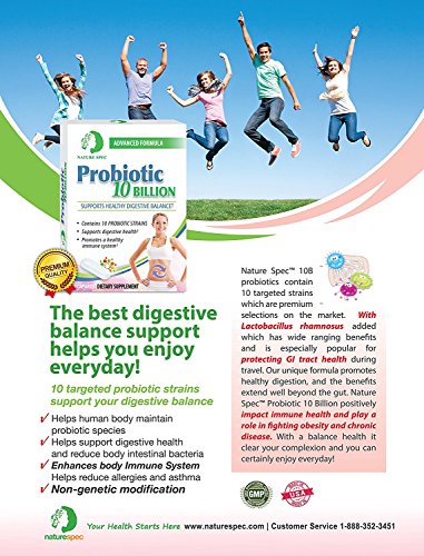 Studio : Nature Spec Publisher : Nature Spec Binding : Health and Beauty Product Description RELIEVES DIGESTIVE ISSUES FAST: If you suffer from gas, bloating, constipation, bacterial overgrowth, or others digestion problem. Nature Spec 10B PROBIOTIC SUPPLEMENTS CONTAIN 10 DIFFERENT SPECIES: Probiotics are specialized plant fibers that nourish the good bacteria that live in your stomach. Research reveals prebiotics, like Bifidobacterium bifidum, promotes a healthy digestive system. SUPERIOR POTENCY AND EFFECTIVENESS: Studies show that without the protection of being enteric coated, most probiotics won't survive the harsh environment of the stomach or even outside. In that case, they are often ineffective in relieving your digestive issues. Nature Spec 10B Probiotics utilizes vegetarian resistant capsules which guarantee the delivery of live probiotics to your gut. As a result, they will be able to travel throughout your entire digestive system, repopulating your gut with healthy and good bacteria. THE BEST QUALITY PROBIOTIC MONEY CAN BUY AND MADE IN AMERICA: GMP Quality Assured. High quality of manufacturing process keeps the probiotics alive longer, increasing shelf life. Equally Perfect for Men or Women. Get the digestive advantage now! 0