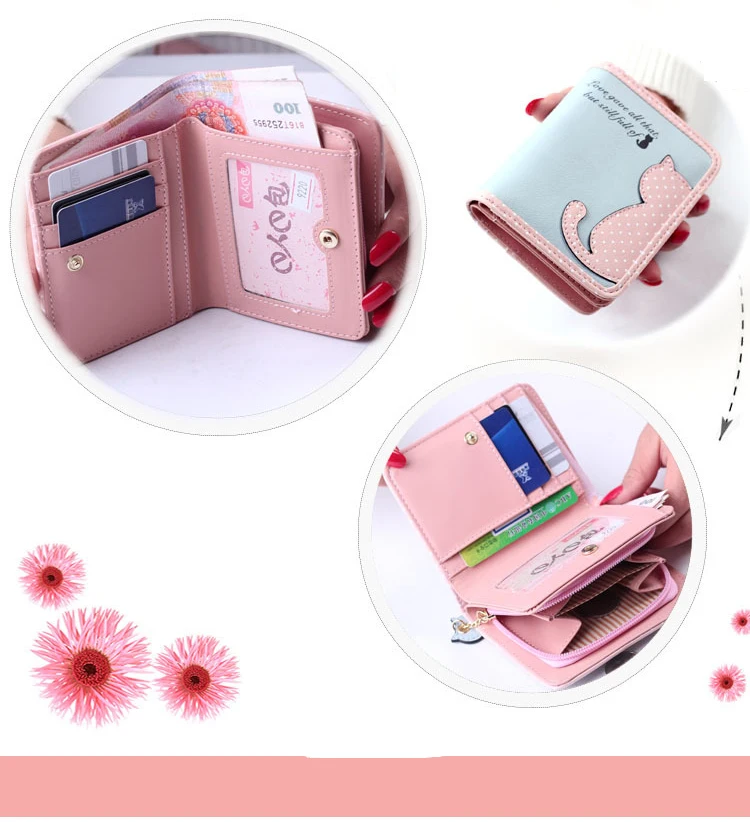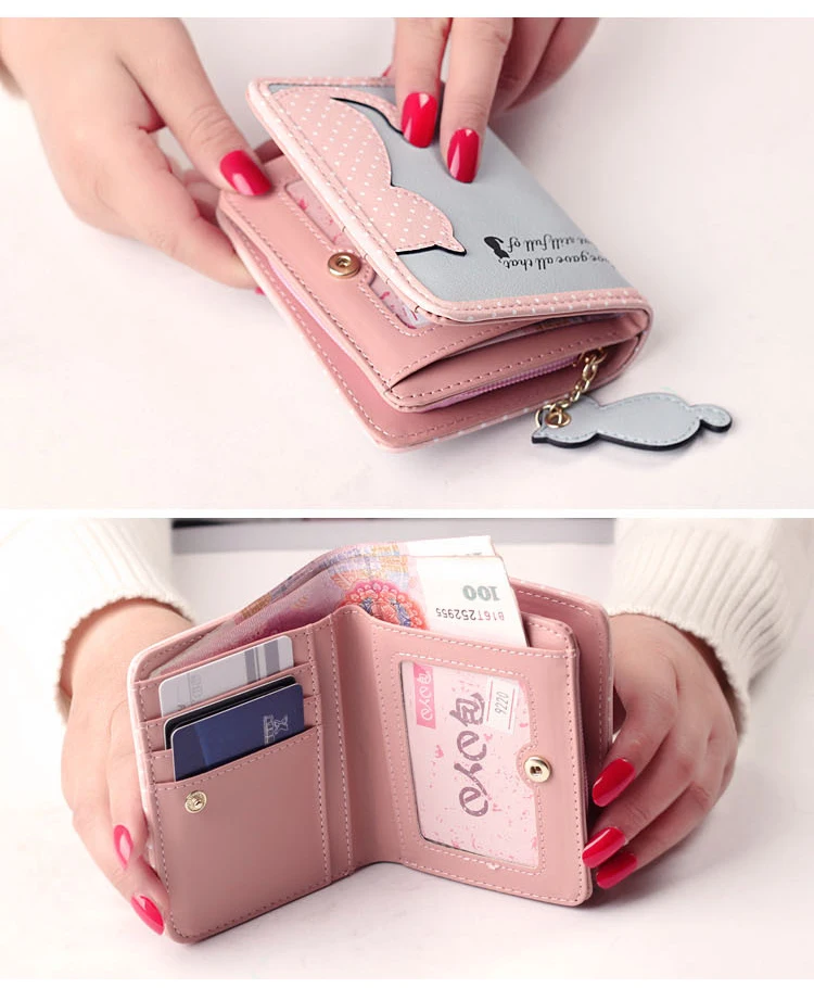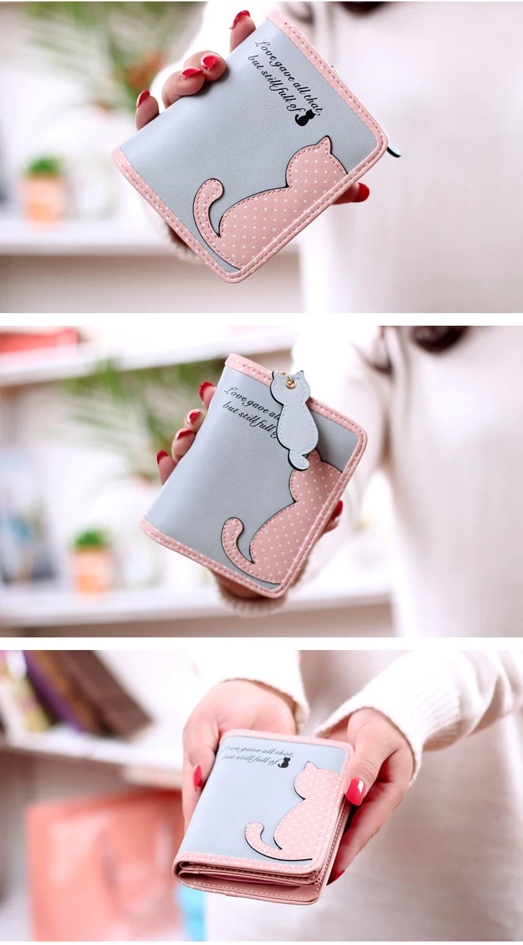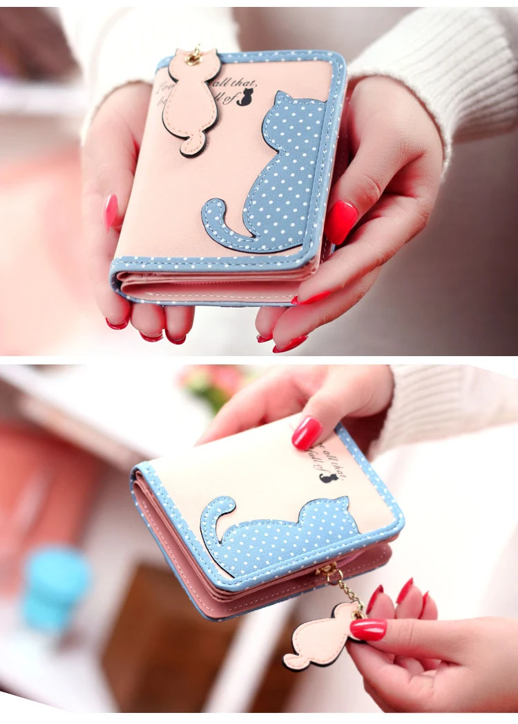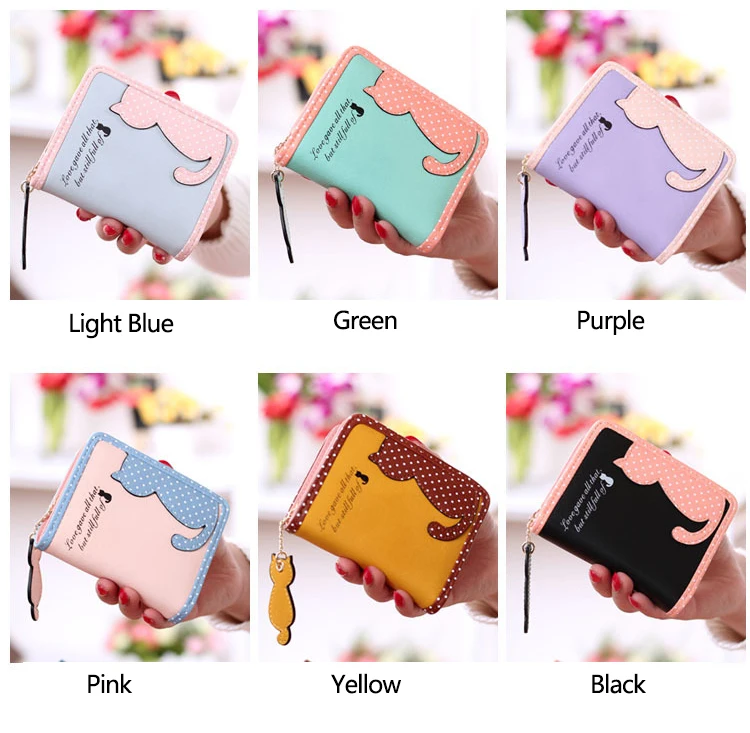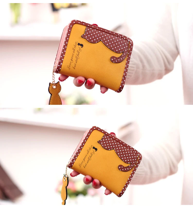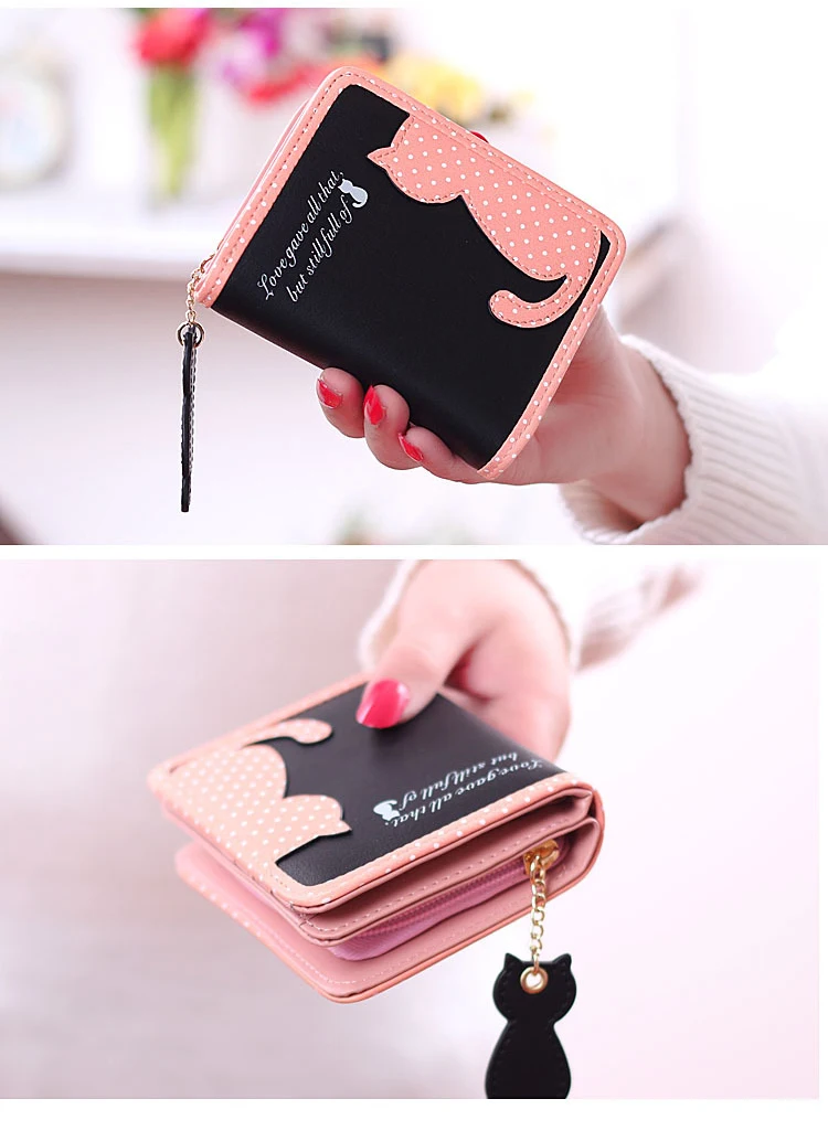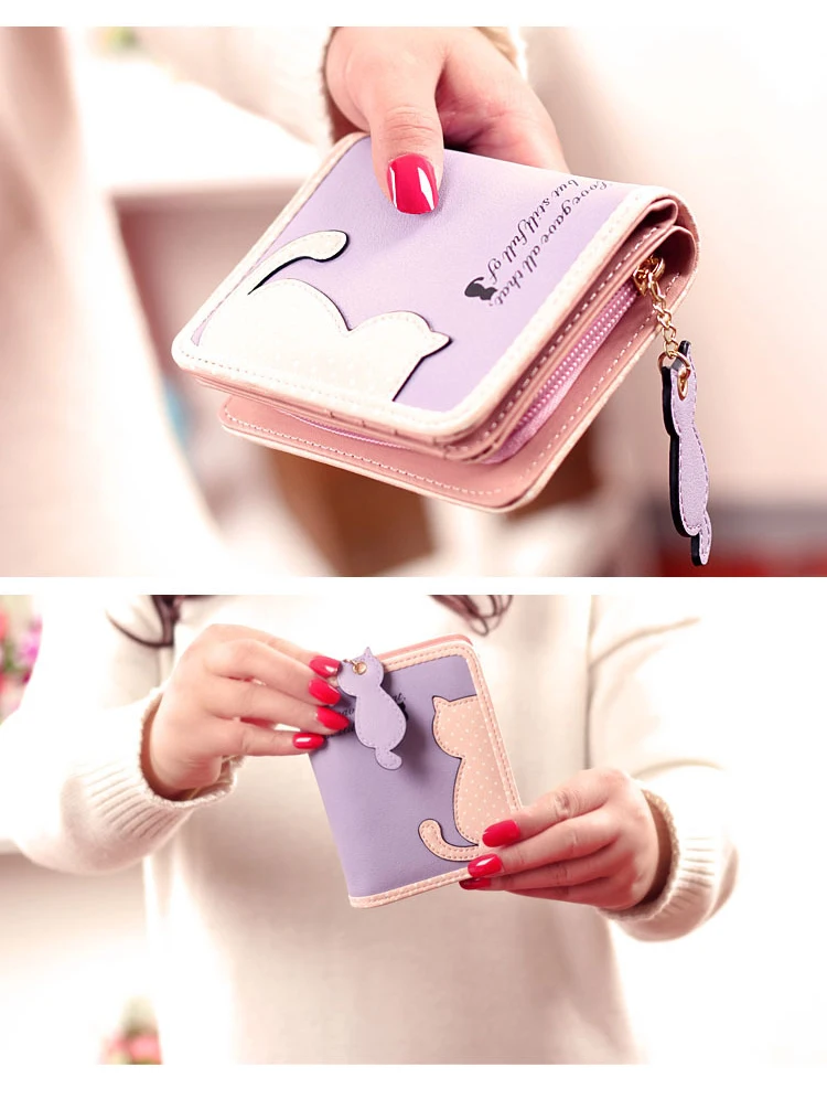 ホット新しいファッションデザイン女性財布qute猫ペンダントレディース財布ヒットカラースプライスジッパー短いクラッチコイン財布カードホルダー