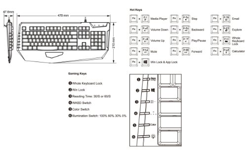 - Feature : Gold-plated USB Connector with 6 Feet Braided Fiber Cable / Anti-ghosting 19 keys with Win Lock Keys / Interchangeable 8 Keys (WASD + 4 Arrow Keys) / Multi-Color Backlit Feature with Brightness adjustment / 10 Multiedia Hot Keys with Control of Video, Audio, and Internet Feature