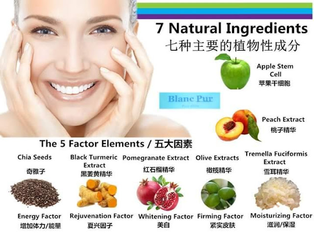 Through meticulous scientific analysis and specialist evaluation, Blanc Pur purely natural skin whitening drink product are proportionally formulated in France and blended to contain such active ingredients as utilizes the best natural whitening agents such as the 2 main ingredients of Tremella Fuciformis & Pomegranate Extract togethere with 5 others natural fruits such as Olive Extract, Black Turmeric Extract, Chia seeds, Apple Stem Cell and Peach Extract.