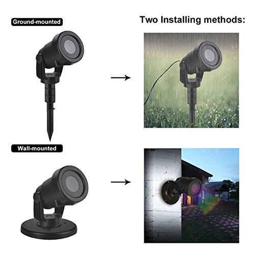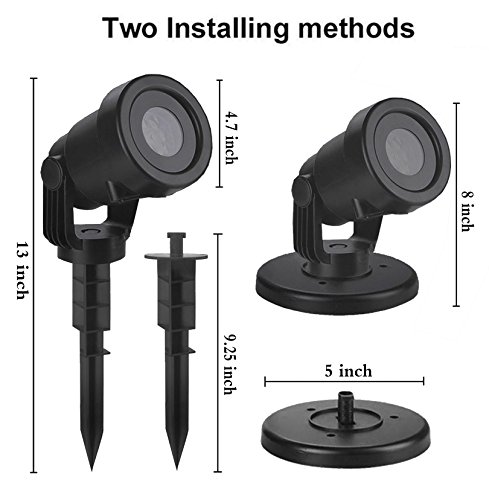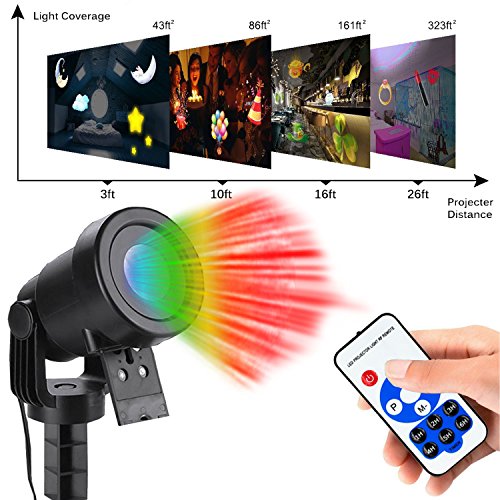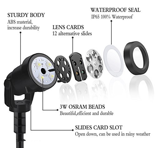 -. Feature : ?Newest Picture For Christmas Projector Lights - Up to 12 pattern sliders, each of them is exclusive designed including Christmas theme, Halloween ghost, Romantic balloon, Love wedding, White snowflake, etc. Suitable for wall and garden decoration.The light power promotes to 6 w instead of 4 w, which make the illumination brighter / ?High Quality & User-Friendly design - The projector lamp is made by waterproof material for indoor and outdoor. No more worry about raining or snowy weather. The projection distance is about 5-15 meters and the largest area of projection is about 50 square meters. With a upgrade version, this new projector can control by a remoter. You can control the lamp such as set a timer, adjust the flashing speed and turn on or off in a distance, which make the operation easier / ?Convenient To Install - It comes with a round base and a long ground stake so it can be either stake in the grass or put in indoor. With a 16ft long cable wire that is long enough to adjust the projector position in your garden to get the best result / ?Widely Used In Various Occasions - The rotatable projector can make the pattern move dazzlingly, which can create festival atmospheres like in wedding ceremony, Halloween party, theme party, home party, banquet, holiday, carnival, etc. Giving the great joy and fun to children and adults / ?Warning And Customer Service - The projector is installed with a thermostatic device inside. Please avoid using the projector over temperature 45? constantly. Once the temperature of the apparatus is above 60?, the film will melt. There is also installed with a device of motor fan that can help to dissipate the heat. If there is any quality problem, please feel free to contact us. We will offer replacement or refund service