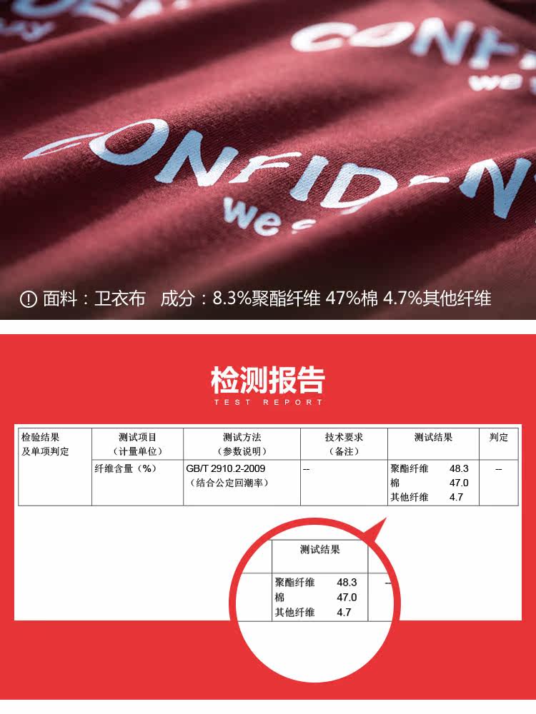 | 面 料:48.3%聚酯纤维 47%棉 4.7%其他纤维 罗纹:98.2%棉 1.8%氨纶颜 色:酒红 |