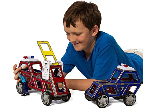 -. Feature : Experiment with different Magformers connections to create your unique vehicles coming to the rescue / This set includes 5 different shapes / Made with high quality and super powerful magnets / Makes a great add-on to any Magformers collection / Perfect set for traveling, because the pieces stick together / An educational experience that's also fun / Also includes an idea guide for inspiration / ABS plastic magnets conform to CE, ASTM and EN71 / You can make police cars and fire trucks using red and blue shapes with accessories. / 33 pieces total: 6 triangles, 8 squares, 6 diamonds, 5 rectangles, 2 trapezoids, 1 figure, 5 accessories.
