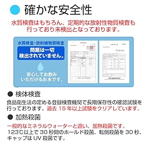 栄養成分(1000mlあたり) 熱量、たんぱく質、脂質、炭水化物 0 ナトリウム 13mg カリウム 6.0mg カルシウム 12mg マグネシウム 3mg 硬度42mg(軟水) pH(6.8)使用方法