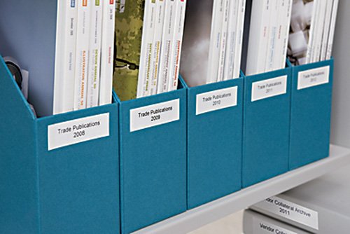 High quality label maker tape that adheres to plastic, paper, metal, wood, and glass and is ideal for labeling office supplies, electronic accessories, tools, kitchen items, garage equipment, and more