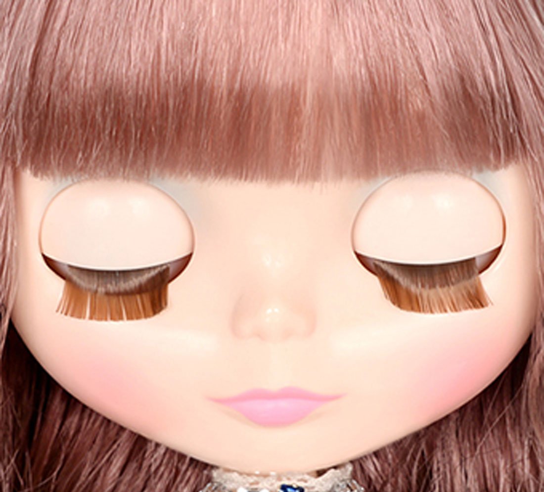 Makeup, eye shadow is blue, teak and lip are pink, eyelashes are the default shape brown.