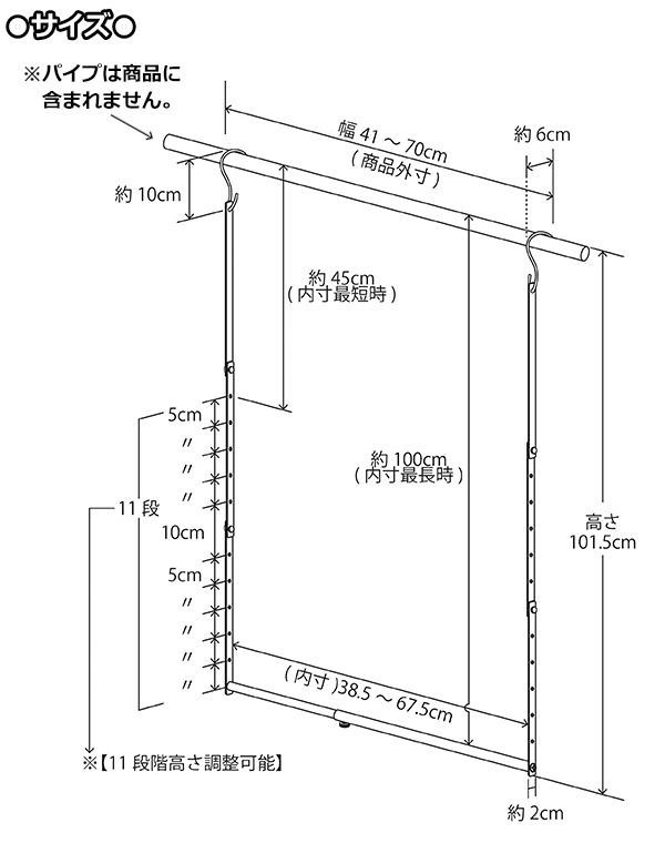 | 仕様 | 組立品 組み立て時間:約10分/1人 全体許容耐荷重:幅最大時約9kg、幅最小時約15kg ハンガーパイプ適応サイズ:φ40mm |