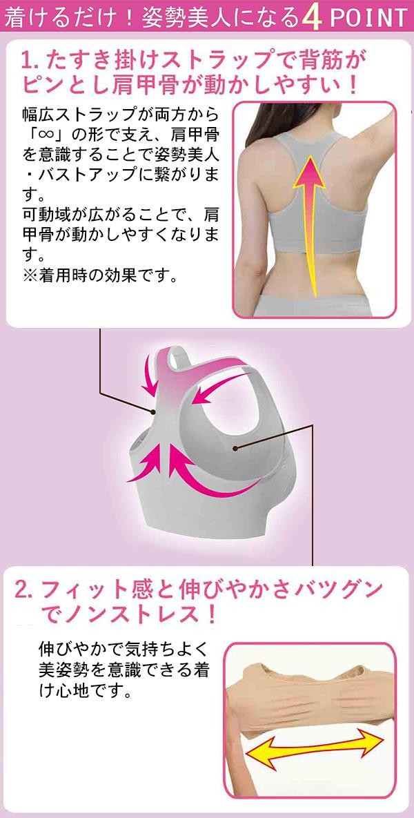 | 着用するだけで背筋がシャキッと!!さらにバストも整え美胸に。肩甲骨を意識することで背筋がスッと伸び、キレイな姿勢を保つことができます。仕事や運動時、家事やリラックスタイムと、様々なシーンでお使いいただけます♪ |