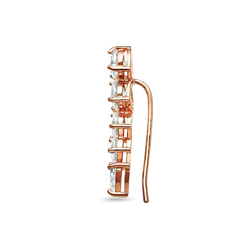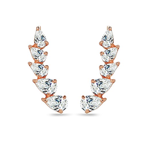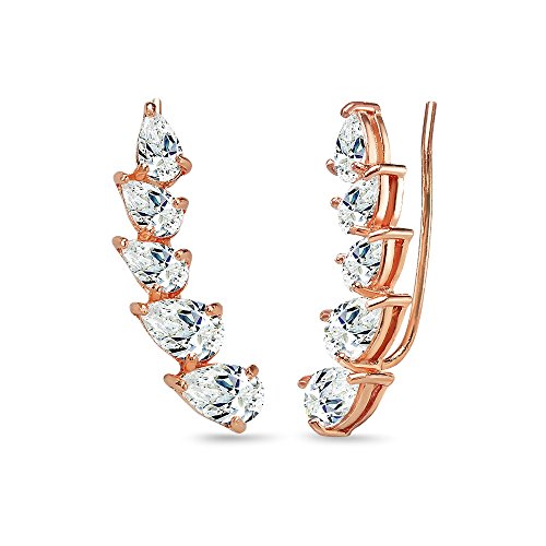 These trendy designed graduating climber earrings are crafted in a highly polished rose gold flashed sterling silver finish. The earrings are studded with pear-cut stones made with Swarovski Zirconia and secure with hooks.