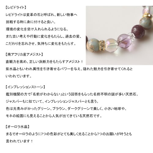 《레피도라이토》:《레피도라이토》는 변혁 돌 로 불리고, 새로운 사물에 도전할 때 몸에 익힐 수 있으면 좋다.환경의 변화를 받아들여지게 된다.또한 오래된 생각이나 행동으로 변화를 가져오고, 과거의 사랑,(엄선)고집을 잊게 하고, 기분으로 변화를 가져온다.