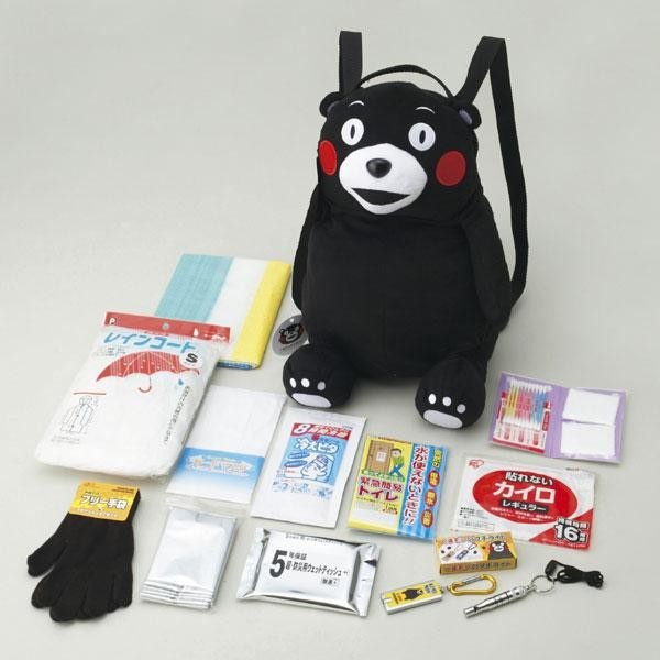 | セット内容 | くまモンのリュック、くまモンのプチライト(ボタン電池付)、防寒シート、カイロ、マスク1枚、ホイッスル、防災用ウェットティッシュ(20枚入)、レインコートSサイズ、緊急簡易トイレ、救急セット(絆創膏Mサイズ・Sサイズ、カット綿、綿棒)、伸縮手袋、熱冷却シート(2枚入)、レジャーシート1畳用 |