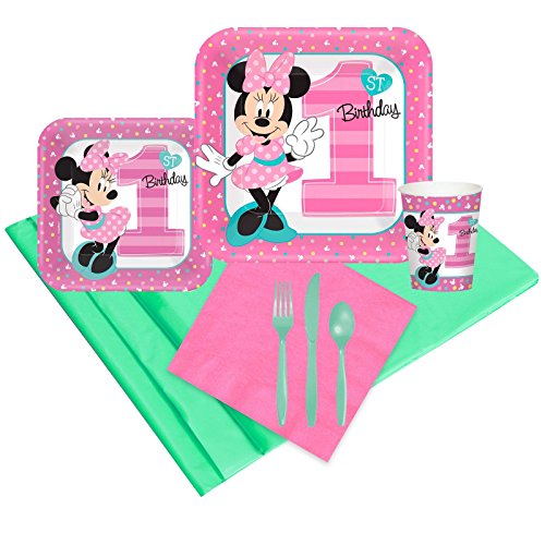 -. Feature : Includes 8 dinner plates, dessert plates, and 9 oz. cups, 16 lunch napkins, 1 plastic tablecover, and 8 forks and 8 spoons. / Add matching tableware, favors, accessories, or a party kit bundle to complete your birthday party! / Make your little one's 1st birthday one to remember with Minnie Mouse.