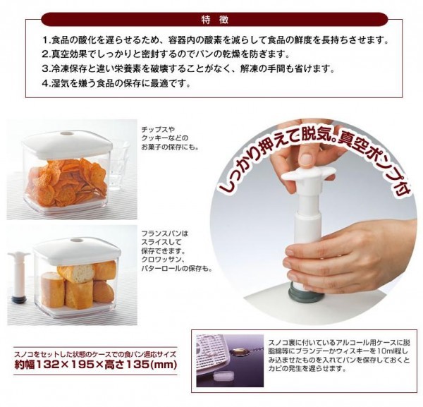 真空効果でパンの乾燥を防ぎ、アルコール効果でカビの発生を抑えます。 製造国:日本(真空ポンプ:台湾) 素材・材質:本体:飽和ポリエステル、ポリプロピレン、シリコン樹脂真空ポンプ:ABS樹脂、シリコン樹脂、ポリエチレン ※サプライヤー直送品 ご注文後2~3営業日後の出荷となります【商品名】pos.184468 真空パンケース ポンプ付き BBR4N