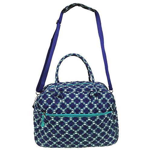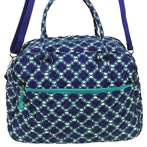 -. Feature : Large quilted cotton weekender style duffle / Lightweight; great carry-on bag or shopping tote / Spacious main zippered compartment, Large outer zip pocket, small inner zip pouch, Detachable adjustable padded shoulder strap / Blue Moroccan Trellis Design, made in China / Bag: 18"w x 13.5"h x 7"d, strap drop: 13"-26" Handle drop: 8", front zip pouch 17.5"w x 8"h Inner zip pocket 7.5"w x 5.5"h