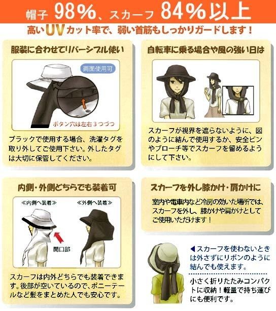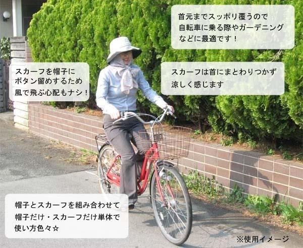 | 自転車に乗る時やガーデニングなどにピッタリ!!着脱可能なスカーフにより、首までしっかり覆える紫外線対策ハットです。帽子はブラックとベージュのリバーシブルでTPOに応じて色を使い分けることができます。 |