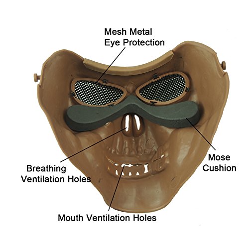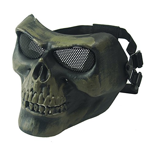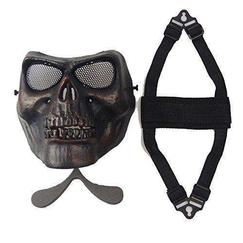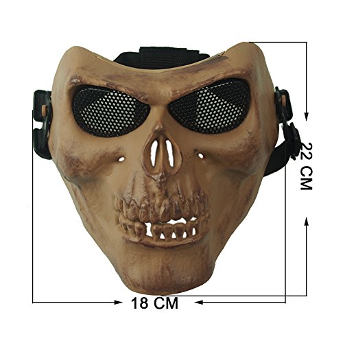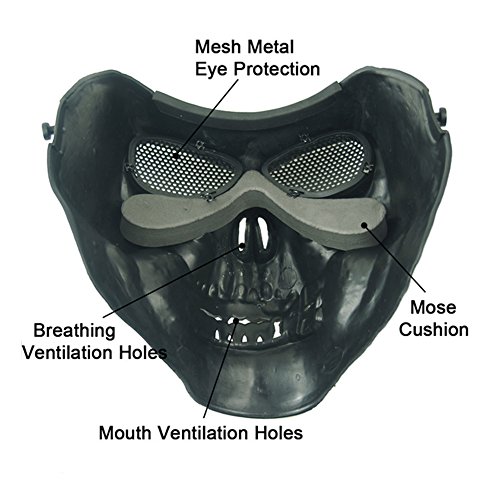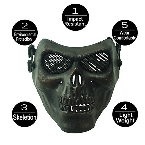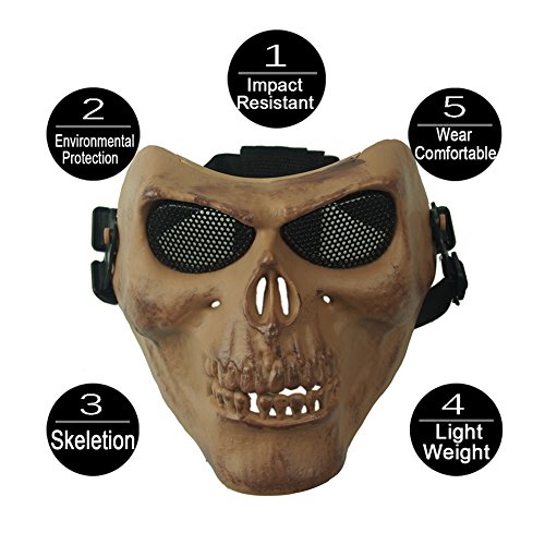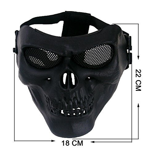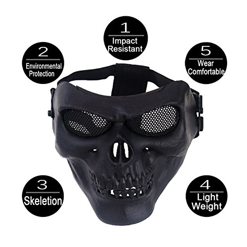 -. Feature : Made of TPU, this mask has passed the ASIN Z80.3 test, Impact Resistance more than 700FPS,offers full face and head protection. / The material is environment-friendly, poison free and no smell. / Skull Element: Mystery and horrifying look, makes you more threatening during the game and activities. / Stable and Comfortable Design: With adjustable elastic straps, the mask will be stable on your head; Foam inside can absorb the impact and keep you safer. / DIY Creation: This mask is not only for the sports, it can be used for Halloween, Cosplay Party, you can also DIY to get your own style.