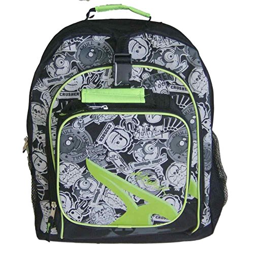 This Airwalk backpack comes with a detachable lunchbox. It has a cool black and gray skull and skateboard pattern with lime green accents