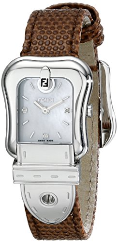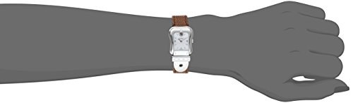 -. Feature : Polished stainless steel, buckle inspired with a top stitch design, Stainless steel caseback (screw-down), Brown leather strap / Mother of pearl dial, Silvertone hands and indices, Three diamond hour markers / Sapphire crystal, Swiss quartz movement, Push/pull crown and a Pin buckle clasp / Case measurements: 23 mm wide x 25 mm long x 7 mm thick, Strap measurements: 14 mm wide x 7 inches long / Water resistant to 99 feet (3 ATM/30 meters)