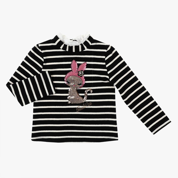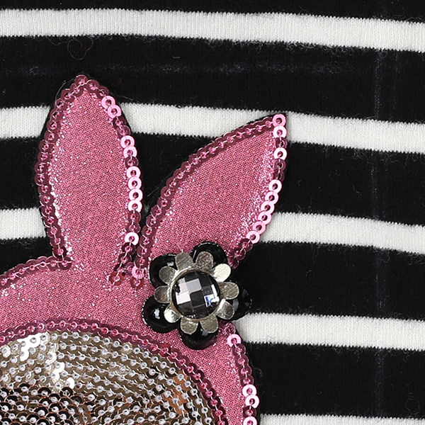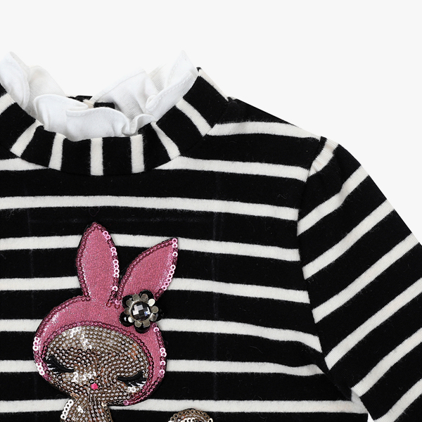 상품설명 스판성이 좋은 스트라이프 소재로 되어 있어 편안하게 코디할 수 있고, 네크 부분에 화이트 프릴이 매치되어 귀여운 느낌을 줍니다. 토끼탈을 쓴 고양이 포인트 자수가 블링블링한 제품입니다.