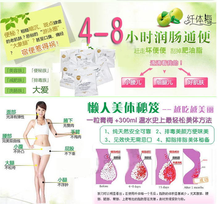 Slimming plum, green plum as the carrier, the ingredients are natural no side effects, the natural principle accelerate intestinal peristalsis, promote detoxification, no collapse a sense of weakness.