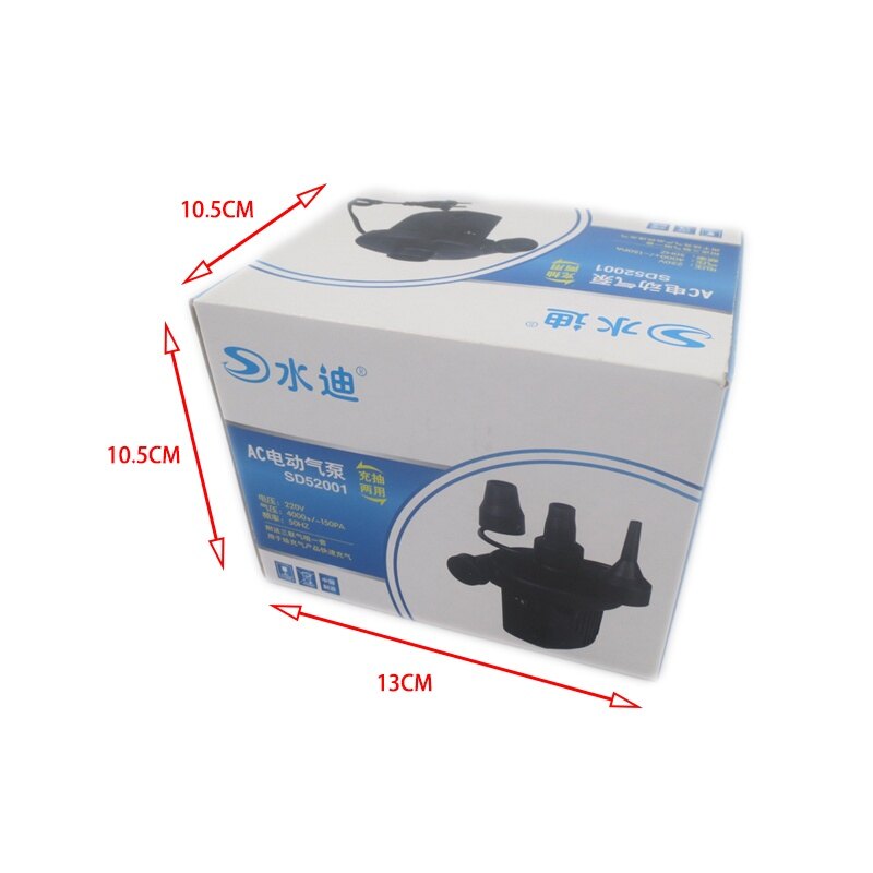 This electric pump free 3 different air nozzle. The user can switch to a suitable air nozzle when they are going to pump a different item. This pump is built with inflation port and deflation port, user can inflation or deflation easily by using it. The cable length of this item is 110cm and the voltage usage is 220V. This item is suitable for most of the inflatable product.