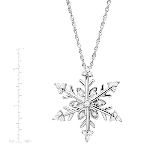 This holiday, wake up to a winter wonderland! A sterling silver snowflake is dotted with sparkling round-cut diamonds, totaling 1/4 ct, making this pendant really shine. Piece measures 13/16 by 3/4 inches. Comes with a sterling silver 18-inch rope chain with a spring ring clasp.Feature