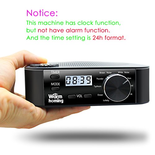 - ✓ OPTIMAL SLEEP TIMER ---15,30,60,90 minutes or a full night sleep timer for option, allows you to decide how long the white noise or lullaby is played in the background. If you want to use it all the night, pls do not set the timer. And please attention: This machine has clock function, but not have alarm function. And the time setting is 24h format.