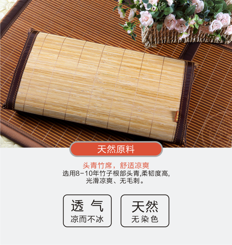 | 产品特点 | 一个枕头,两种享受:一面采用古(原)藤席面,凉而不冰,透气性好;一面选用八年以上老竹的头青,吸汗凉爽。 |