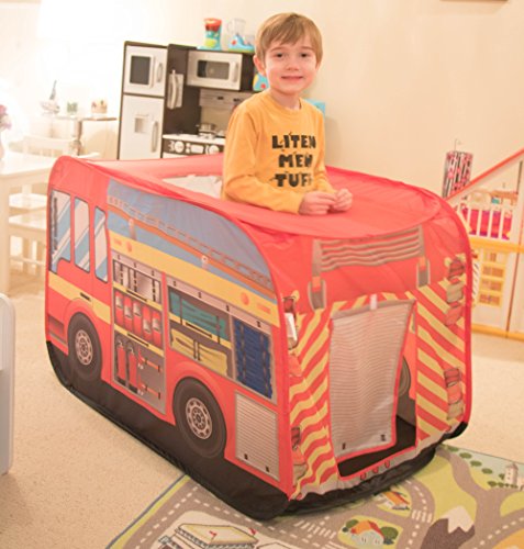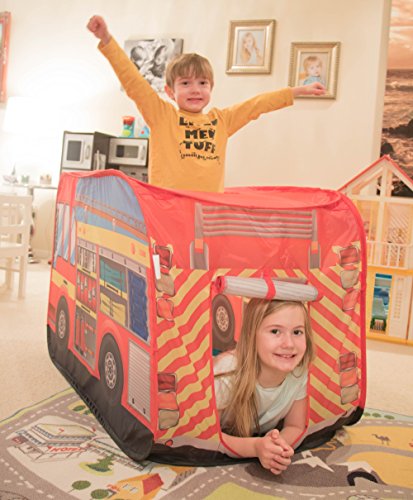 -. Feature : ENDLESSLY IMAGINATIVE: Rush to fight raging fires all around the house with this collapsible fire truck play tent! Let your children's imagination run wild as they protect the town from make believe fires in this fire engine tent! The structure allows plenty of children to enjoy fun for hours at a time / SET-UP IN MINUTES: The flexible supports inside this play tent make setup tool-less and extremely easy. The simplicity allows it to be easily disassembled and stored countless times / PERFECT SIZE: When fully constructed, this tent measures 43" x 27.5" x 27.5" and can fit children, and spaces of all sizes. This convenient tent is an ideal addition to any child's play space / COOL HIDEOUT FOR KIDS: The flaps on the side give kids a secret hideout with plenty of space; with plenty of color; and buckets of fun / 100% SATISFACTION GUARANTEE: We are committed to quality, safety, and your satisfaction when purchasing Clever Creations products. As the manufacturer we offer a full refund or replacement guarantee for 1 (one) full year. If you are ever not satisfied for any reason, please contact us directly. We love this Tent, and we know you will too