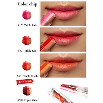 -. Feature : A triple-colored lip tint that creates / petal-bitten gradient effect with a single touch. / Apply a moderate amount according to lips line gently. / #101 Triple Pink #501 Triple Red #601 Triple Peach
