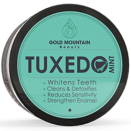 'TUXEDO' GENTLY WHITENS OVER TIME: Our natural whitening formula gently removes surface stains from coffee, wine and soda, to reveal whiter, bright teeth. Use daily for 30 days to see results. This product does NOT bleach teeth with chemicals. Natural teeth whitening for sensitive teeth. 34 gram jar.