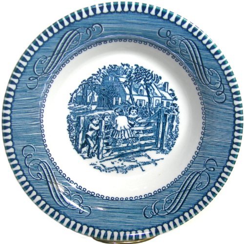 -. Feature : Vintage 1950's Blue Currier & Ives 5.5" Fruit / Dessert Bowl - Old Farm Gate / Manufactured by Royal of Sebring, Ohio, during the 1950's / Plate measures 5.5" diameter / Blue scene center with scroll design border