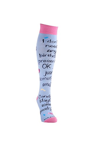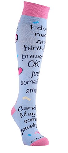 -. Feature : A great pair of fun knee high novelty socks! / 85% Peruvian Cotton, 10% Nylon, 5% Spandex / Sizing: Sock size 9-11 (will fit a women's shoe size 5-10) / Designed in Venice, California and Manufactured by our partner in Peru / Text Reads: "I don't need any presents! Ok... Just something small. Candy? Maybe some Jewelry"