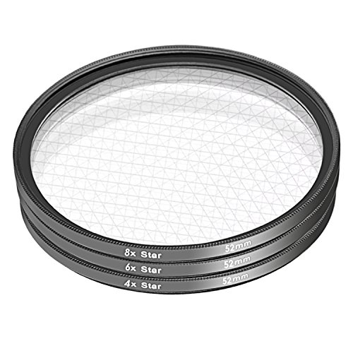 Various Filter Choices:4 Points Star Filter /6 Points Star Filter /8 Points Star Filter can generate 4/6/8 radiation lights, and in practice, only stronger point light source can create star shapes;Compatible with 52mm camera lenses