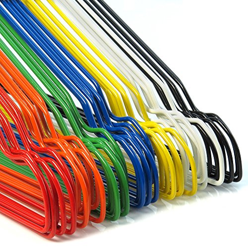-. Feature : Pack of 100 Galvanised Steel metal hangers with a tough, plastic powder coated finish in a mixture of attractive colours. (RED, YELLOW, BLUE, GREEN, ORANGE, BLACK, WHITE). Silver neck and coloured tip. / 13 gauge (stronger than 13.5 or 14 gauge). 16 inches approx. Shoulder notches for added versatility. Squared neck shape for better presentation of shirts etc. Neck length of hanger suitable for use by dry cleaning companies. / Bright and cheerful colours , useful for color coding if needed. Ideal general use hanger for shirts, blouses, trousers, skirts, dresses etc. Excellent value - Our best quality 13 gauge wire hangers. / New & packaged in Hangerworld Box. Pants and shoulder guards also available for use with these hangers. / Please note that 13 gauge (British Standard Wire Gauge) is 2.337mm but standard manufacturing tolerances mean that the wire may +/- 10% of this measurement.