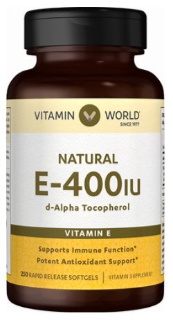 DESCRIPTION • Supports heart and cardiovascular health** • Provides beneficial antioxidant support** • Convenient one-a-day dose Vitamin E is an antioxidant vitamin that helps fight cell-damaging free radicals in your body.** Just one easy-to-swallow, rapid release softgel a day is a great way to get the Vitamin E you need to support heart health, healthy circulation and healthy skin.** 100 softgels. Read More Gluten Free Rapid Release LABEL INFORMATION Supplement Facts Serving Size 1 Softgel Amount Per Serving Daily Value Vitamin E400IU 1,333% (as dl-Alpha Tocopheryl Acetate) Directions: For adults, take one (1) softgel daily, preferably with a meal. Ingredients: Gelatin, Vegetable Glycerin, Soybean Oil.Feature