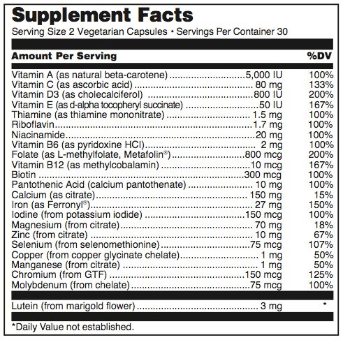 BIOAVAILABLE: Includes Metafolin L-methyfolate and vitamin B12 as methylcobalamin, the bioavailable forms of vitamins that the body utilizes directly. Lutein, an important carotenoid, has also been added for its benefit to the healthy developing baby.*