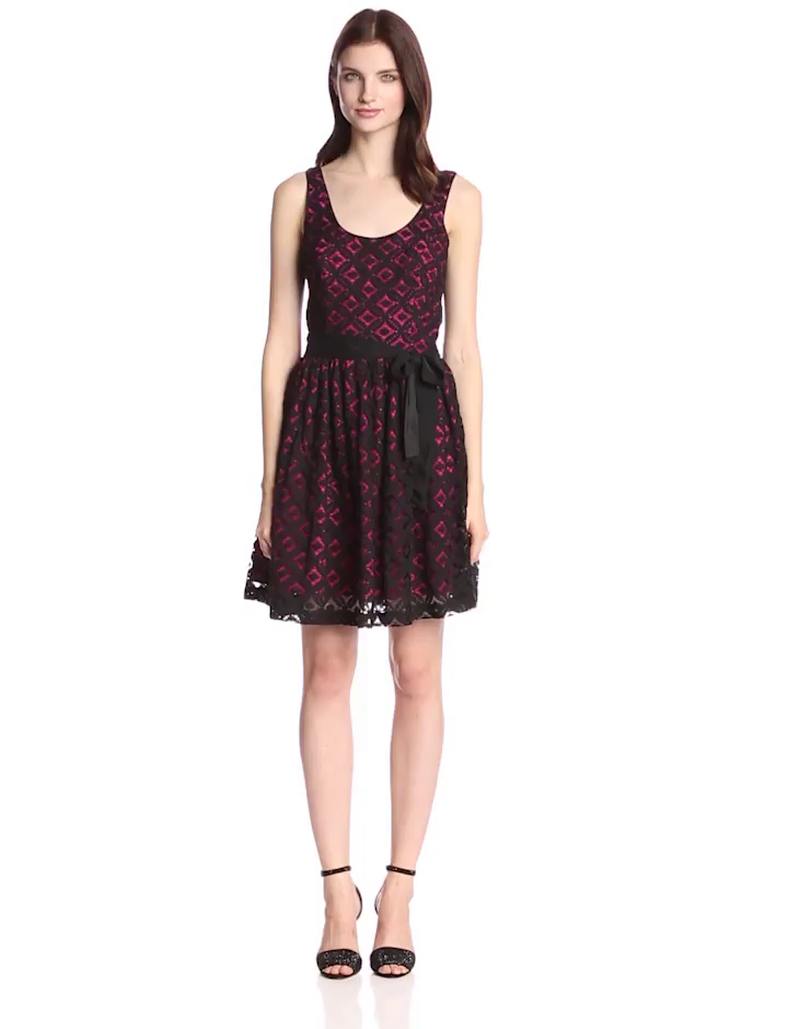 Amanda Uprichard Women's Lace Fit and Flare Dress with Bow Belt, Black/Hot Pink, Medium