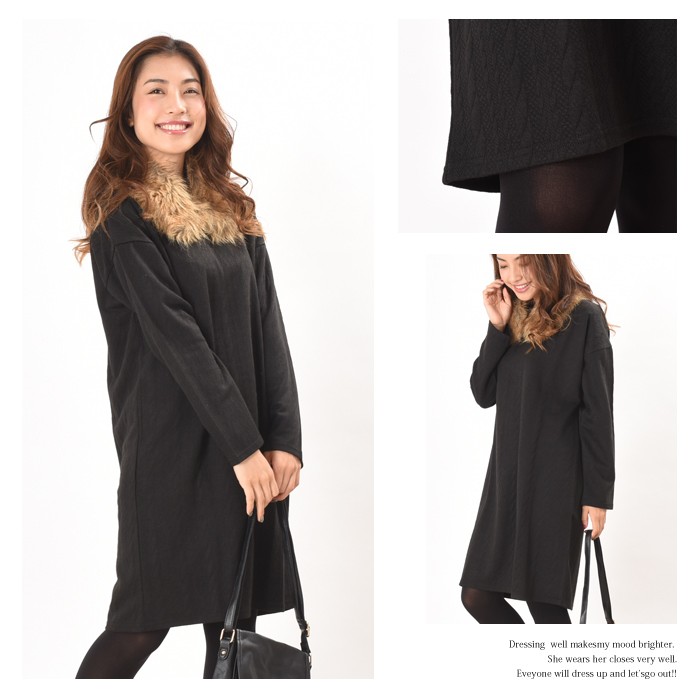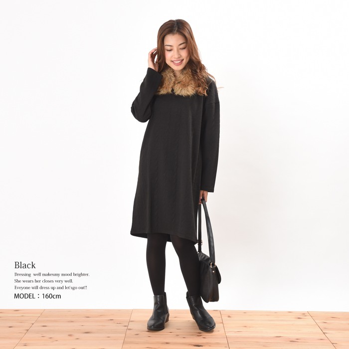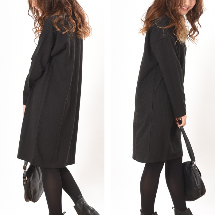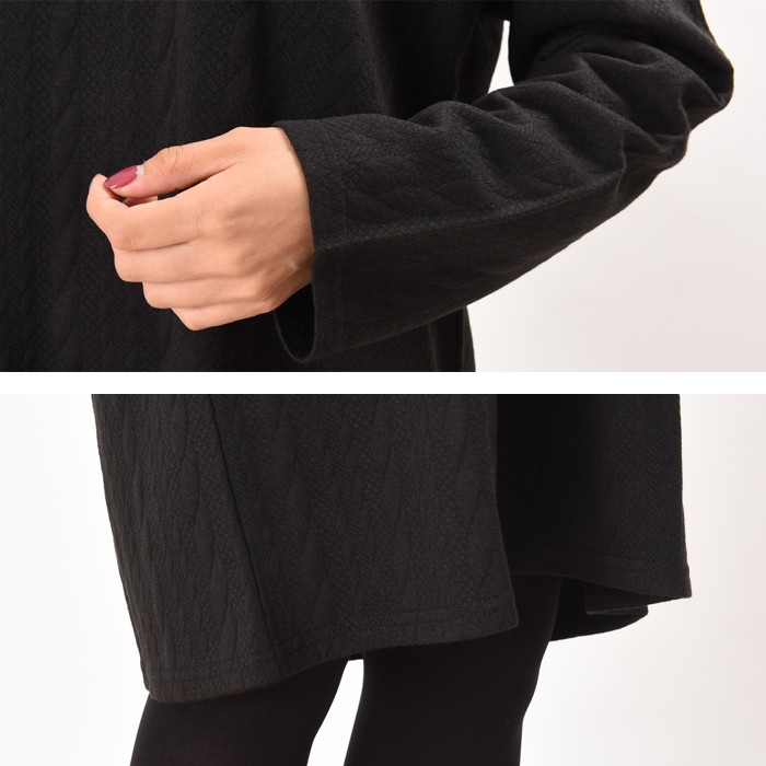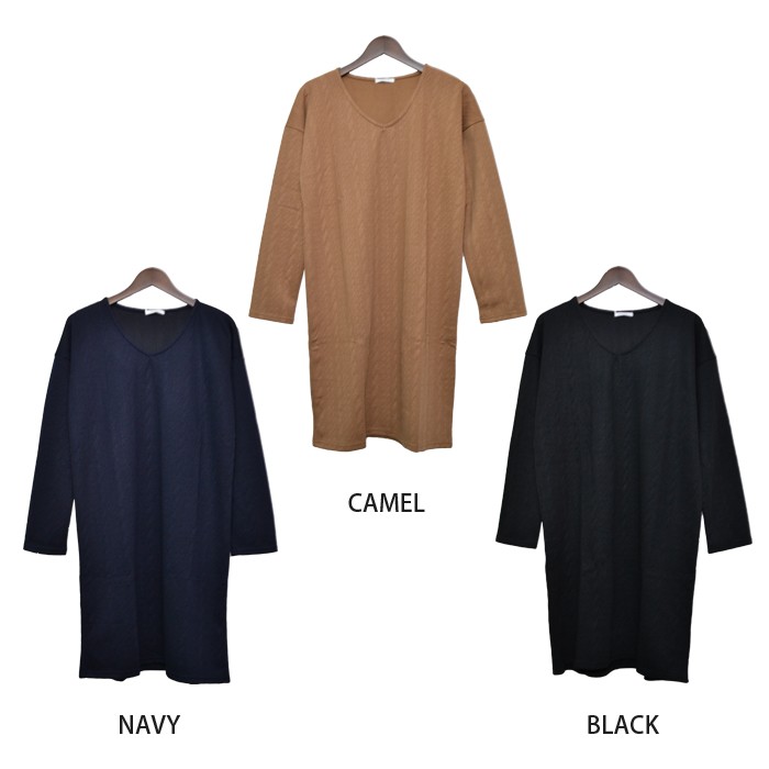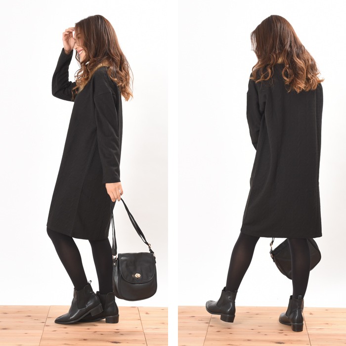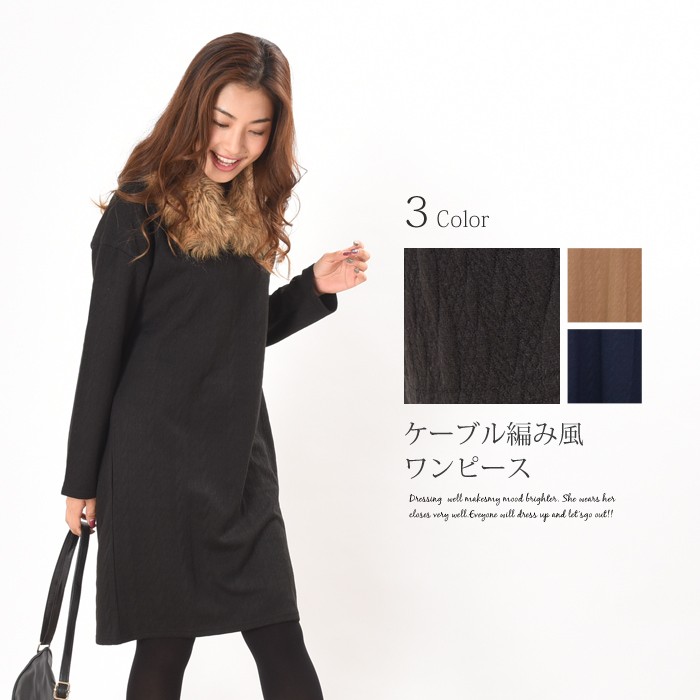 しっかりとした少し厚手の生地にケーブル編みのように立体感のある模様があり、オシャレな雰囲気たっぷりのカットケーブル素材のワンピースです。
