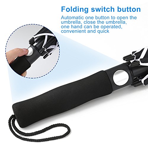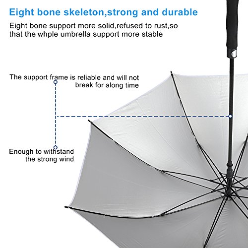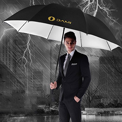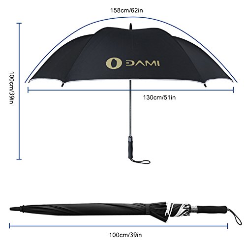 -. Feature : SUPERIOR WATERPROOF/WINDPROOF AND SUPERIOR UV PROTECTION- DAMI large umbrella is fortified with 9 fiberglass ribs, meanwhile, the premium Teflon fabric with silver coating that is water repellent and quick to dry, it can protect you from strong wind, heavy downpour or under the sun / COMFORTABLE & FASHIONABLE DESIGN- Canopy opens up to a 62" arc, 51" diameter, it is big enough to provide protection for many people for any weather condition from Winter storms to the long hot days of Summer. The ergonomic handle provides comfortable grip for both left and right-handed users and fits into most golf cart umbrella mounts with a matching sleeve for convenient storage / HIGH QUALITY MATERIALS- The surface of this kind of umbrella is made of ultra-high density pongee fabric. The frames are a combination of electroplated steel shaft and premium resin-reinforced fiberglass ribs / STRONG BUILD AND INTUITIVE USE - Simply OPEN the umbrella with a press of a button within one second. Its Auto OPEN feature gives you quick rain and sun protection. Moreover, our Premium Fiberglass and Stainless Steel Frame System cries out NO rust, NO breaking / THE ULTIMATE GOLF UMBRELLA With a 62-inch oversize canopy and heavy duty design the DAMI Ultimate Golf Umbrella is an ideal companion for golfers, the business professional or for daily life. With its sleek all black design, comfortable EVA / ABS grip, sturdy frame and auto open mechanism, the DAMI Ultimate Golf Umbrella is perfect in a metropolitan city or a sports field!
