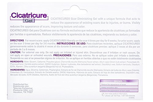 • With this formula, Cicatricure gel for Scars visibly decrease the length, thickness and the coloration of new and old scars as well as other blemishes left by burns and acne.