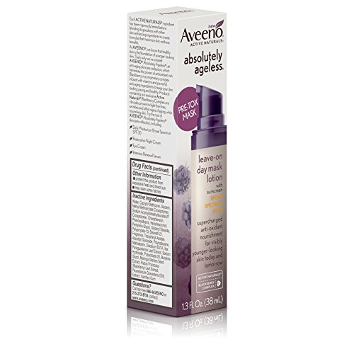 -. Binding : Health and Beauty -. Brand : Aveeno -. EAN : 0381371172856 -. Feature : 1.3-fluid ounce bottle of anti-aging leave-on day mask face lotion that keeps skin looking youthful and healthy for longer / Anti-aging facial moisturizer helps decrease the risk of early skin aging by visibly reducing the look of fine lines and wrinkles in just 1 week / Contains supercharged pollution-fighting antioxidants and provides broad spectrum SPF 30 UVA and UVB protection to fight against aging caused by the sun / Contains Active Naturals Blackberry Complex, a proP.R.Ietary complex infused with vitamins and anti-aging ingredients for younger looking skin / Super-lightweight and non-greasy formula is hypoallergenic and non-comedogenic to work perfectly under makeup -. IsAdultProduct : 0 -. Label : Johnson & Johnson Consumer Inc. -. Manufacturer : Johnson & Johnson Consumer Inc. -. MPN : ZC0104691 -. NumberOfItems : 1 -. PackageQuantity : 1 -. PartNumber : ZC0104691 -. ProductGroup : Beauty -. ProductTypeName : BEAUTY -. Publisher : Johnson & Johnson Consumer Inc. -. ReleaseDate : 2017-09-10 -. Studio : Johnson & Johnson Consumer Inc. -. Title : Aveeno Absolutely Ageless Leave-on Day Mask Face Lotion with SPF 30, Anti-Aging Skin Care, 1.3 fl. oz -. UPC : 381371172856