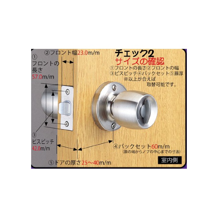 체크2:1,프론트의 길이57밀리 2,프론트폭23밀리 3,비스 피치42밀리 4,백 세트60밀리(문의 끝부터 노브의 중심까지의 치수) 5,도어의 두께25~40밀리