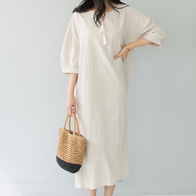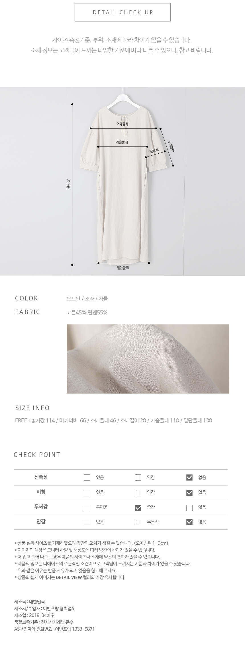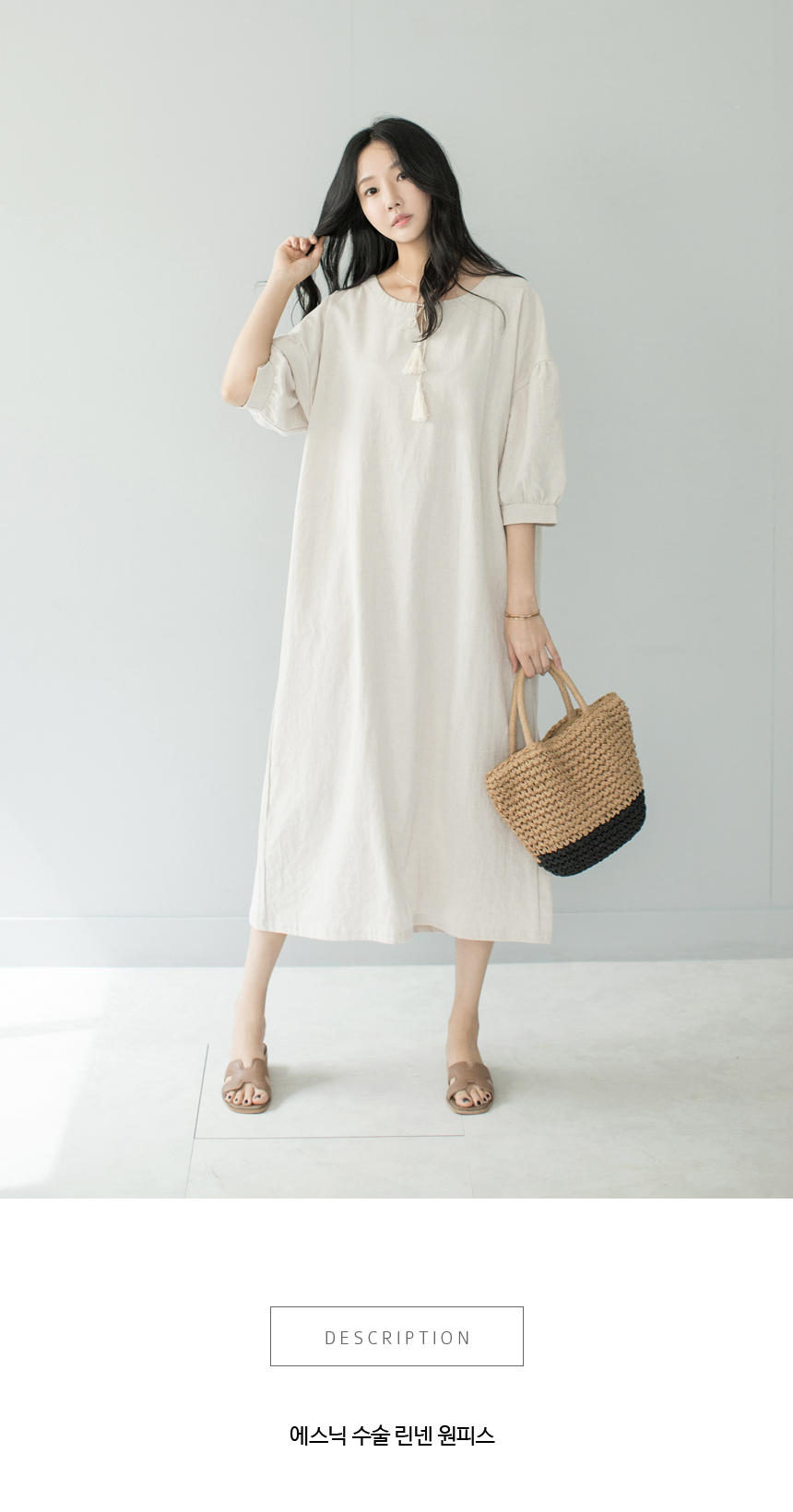 에스닉한 무드의 수술포인트 원피스에요린넨혼방 소재로 편안하고시원한 착용감을 드리구요~퍼프소매 디자인으로 슬림한팔라인을 연출해드려요~사이드 포켓으로 실용성을 더했구요뒷면에 핀턱디테일을 넣어자연스럽게 셔링이 잡혀 멋스러워요~네츄럴한 컬러감이 매력적인원피스로 추천드려요 색상은 오트밀,소라,차콜사이즈는 FREE 44~77