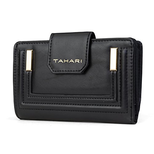 -. Feature : BEAUTIFULLY DESIGNED SMALL WOMENS WALLET - A stylish vegan leather pattern with a snap closure features: 8 credit card pockets, 4 vertical pockets, 1 Picture Photo / ID window, 1 zippered pocket and cash pocket. / WOMENS RFID WALLET BLOCKING TECHNOLOGY - This TAHARI RFID blocking wallet clutch stops theft and electronic pick pocketing, protect your credit cards, debit cards, drivers license, bank cards or any other RFID enabled cards / PERFECT SIZE - Our RFID Blocking small womens wallet Clutch is perfect to travel with or a night on the town, each wallet is 6" x 3.5" x 1" inches, big enough to hold your essentials but small enough to fit inside your purse / WOMENS SMALL COMPACT WALLET - This TAHARI wallet is fashionable cute wallet that will match your work outfit or your date night outfit. / 100% SATISFACTION GUARANTEED - We are confident that you will love your new wallet, if for some reason you are unhappy please let us know and we will replace or refund your wallet
