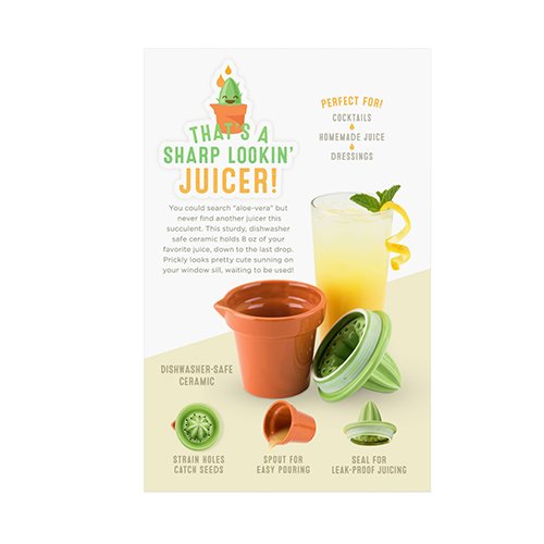 You could search "aloe-Vera" but never find another juicer this succulent. This sturdy, dishwasher safe ceramic holds 8 oz. of your favorite juice, down to the last drop. Prickly looks pretty cute sunning on your window sill, waiting to be used!.Feature