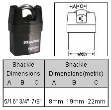 DIMENSIONS: 2-1/8 (54mm) wide heavy steel body, each weighing 1.55 lbs. A 5/16 (8mm) diameter hardened boron alloy shackle with 3/4 (19mm) inside height clearance.