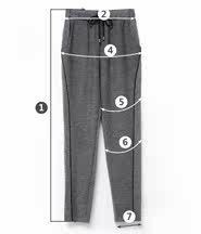 | 尺码 | ①裤长 | ②腰围 | ③腰围 拉量 | ④臀围 | ⑤大腿围 | ⑥膝围 | ⑦脚围 | ⑧前裆 | ⑨后裆 | ||