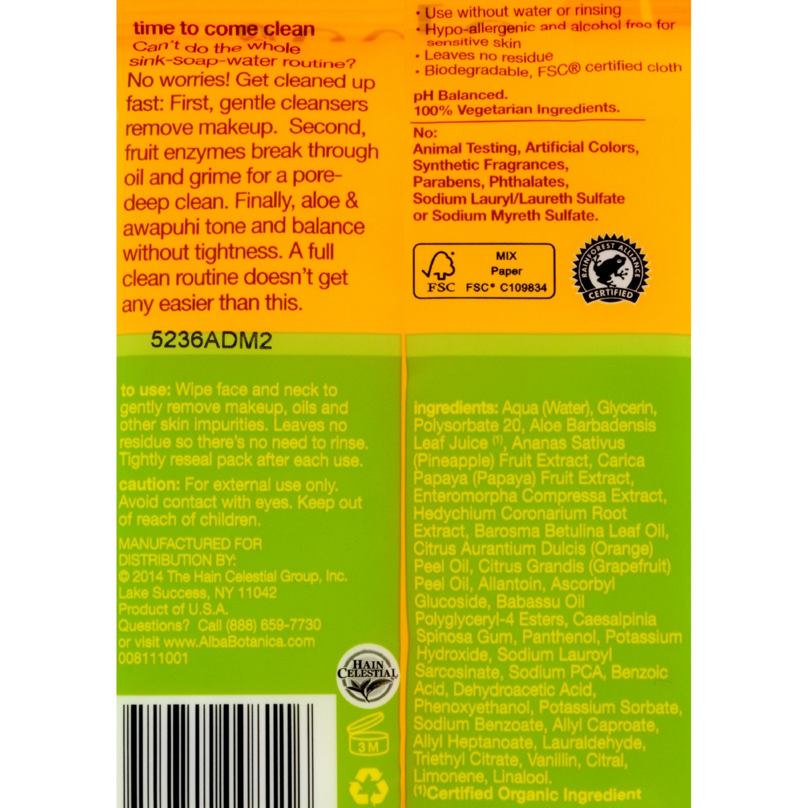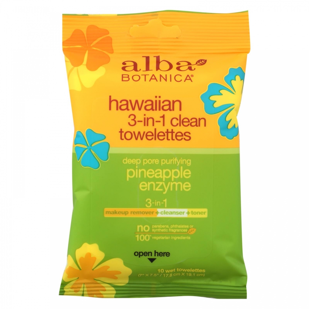 | Natural Hawaiian 3-in-1 Clean Towelettes delivers a natural way to clean and purify your face and skin with natures own pineapple enzymes. When you don't have time to wash your face with a sink and need to remove make up or dirt you have now have a fast natural solution. The delicate cleaning agents remove material like makeup while the pineapple and papya enzymes work by breaking up oil on the skin to get a deep pore wash. The full moist cleansing towelette finishes with aloe and awapuhi that leaves your skin refreshed and balanced. Natural Standards: pH Balanced. 100% Vegetarian. No: Animal Testing, Artificial Colors, Parabens, Phthalates, Sodium Lauryl/Laureth Sulfate or Sodium Methyl Sulfate. Ingredients : Aqua, Carthamus Tinctorius (Safflower) Seed Oil, Cetearyl Alcohol, Glyceryl Stearate SE, Glycerin, Butyrospermum Parkii (Shea Butter), Organic Helianthus Annuus (Sunflower) Seed Oil, Dimethicone, Cannabis Sativa (Hemp) Seed Oil, Tocopherol, Ascorbic Acid, Glycosphingolipids (Plant Ceramides), Allantoin, Organic Aloe Barbadensis Leaf Juice, Ulva Lactuca (Sea Lettuce) Extract, Yeast Extract, Lecithin, Organic Algae Extract, Rosa Canina (Rose Hip) Fruit Oil, Panthenol, Hydrolyzed Soy Protein, Glyceryl Caprylate, Glyceryl Undecylenate, Potassium Cetyl Phosphate, Xanthan Gum, Sorbitol, Citric Acid. Country of origin : USA Size : 10 CT Pack of : 8 Product Selling Unit : case |