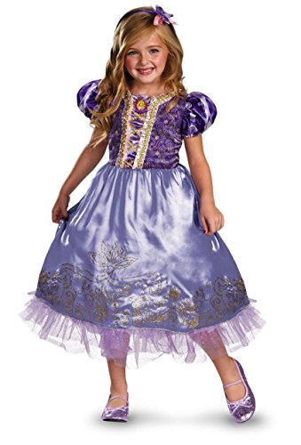-. Binding : Apparel -. Brand : Disguise -. Color : Purple -. Department : girls -. Feature : Includes dress, satiny petticoat and headband. / Shoes are not included. / Available in sizes Toddler (3T-4T) and Kids Small (4-6) and Medium (7-8). / This is an officially licensed Disney P.R.Incess (TM) Costume. / Includes one two-toned purple dress with short puffy sleeves, character cameo, satiny petticoat and headband. -. ProductGroup : Apparel -. ProductTypeName : DRESS -. Title : Rapunzel Sparkle Kids Costume deluxe